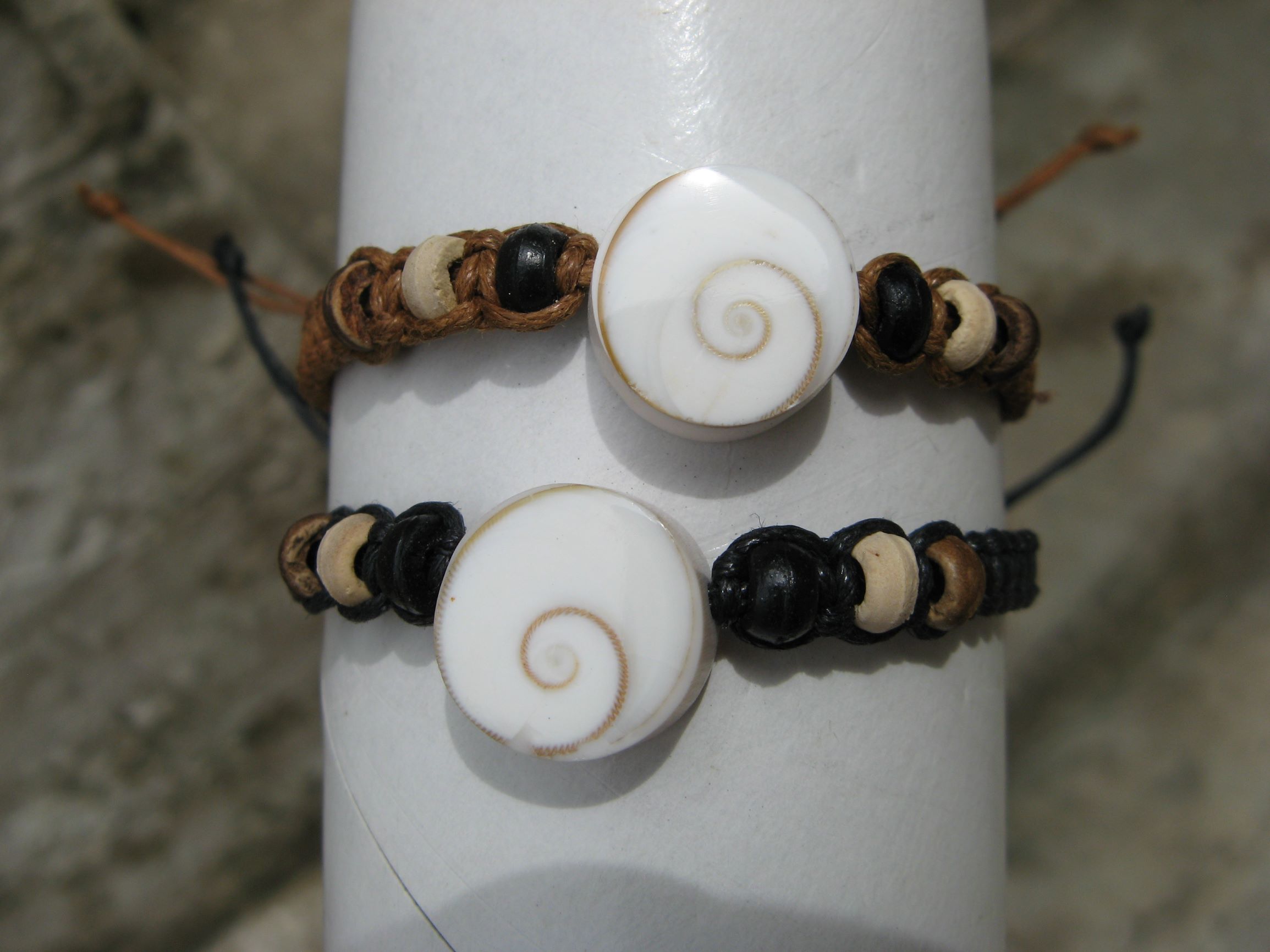 Leather string with Naxos stone Braided leather string bracelet with single ”Naxos-stone”. code: sofi-11-13 See also different: Black & brown with mixed beads Multiple string and leather bracelets in black & brown. Mixed beads. code: sofi-30 Letaher with shark tooth Leather bracelet with single shark tooth. Colors: light or dark brown and black. code: sofi-18 Leather with shell Beautiful and popular leather bracelet with single shell. code: sofi-15 << return to listing