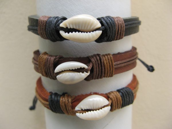 Leather with shell Beautiful and popular leather bracelet with single shell. code: sofi-15 See also different: Black and brown with wooden beads Multiple string and leather in black & brown. Various wooden beads. code: sofi-24 String and leather with beads Multiple string and leather bracelet with various beads and shells. Comes in many color-schemes. code: ferry-leather-shell Letaher with shark tooth Leather bracelet with single shark tooth. Colors: light or dark brown and black. code: sofi-18 << return to listing