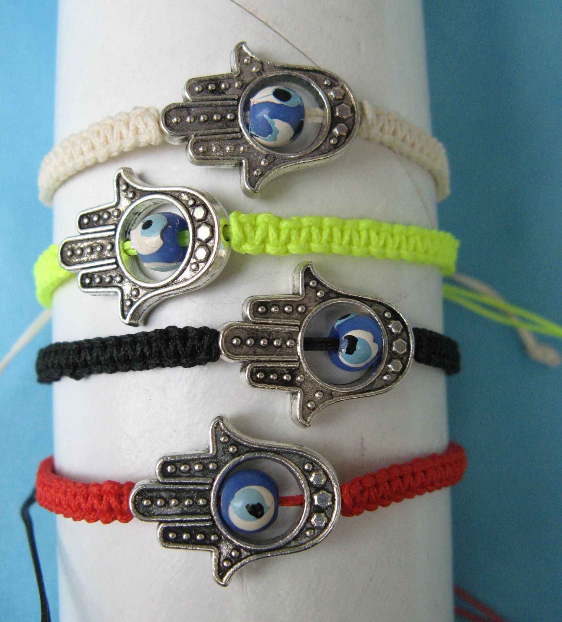 Lucky eye and blessing hand Wooven bracelet with hand and lucky eye. code: ferry-adults-no-1 Description Also shipped as single lucky eye. code: sofi-1 Wooven bracelet with single lucky eye See also different: Bracelet with beads – for kids Very popular and colorful bracelet with various beads for kids. code: ferry-no-2-kids Wooven string with beads and symbols String wooven bracelet with various beads and symbols. code: ferry-thai String braided with beads, shells and gems Popular string braided bracelet withsmall beads, gems and shells. Comes in many beautiful colors. code: ferry-3 << return to listing
